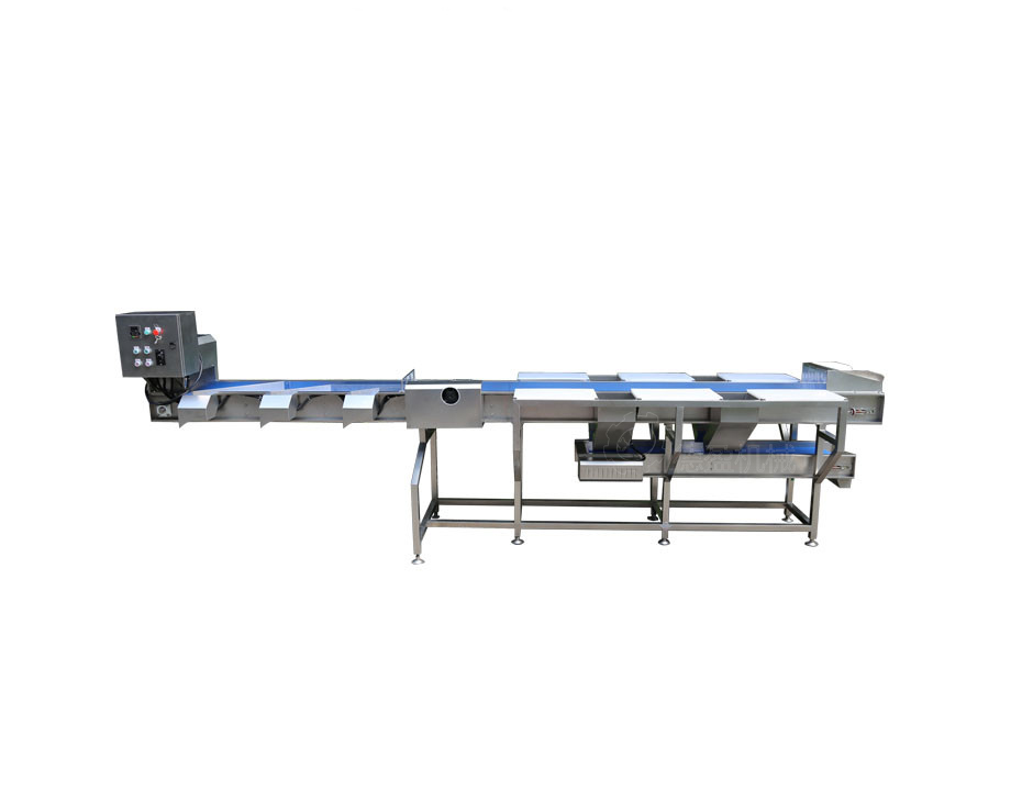 操作工位分两边,工人将废杂物拣出,放入废料斗。优质物料则往前输送,分别从不同轨道的出料口掉下进行切割。